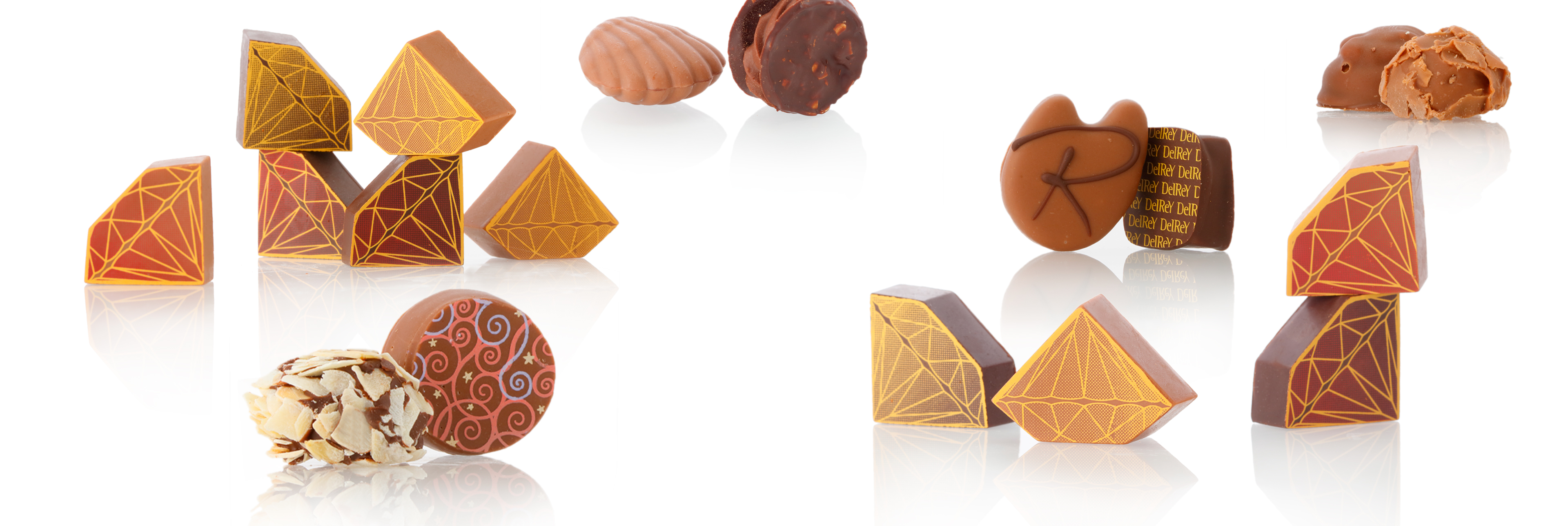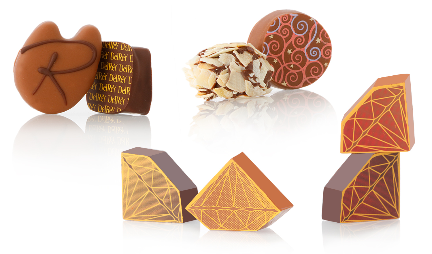 4個入 RSダイヤモンドショコラを中心に、デルレイの中でも特に人気の高いショコラを集めました。ダーク・ミルクショコラの風味の他、ヘーゼルナッツの食感をお楽しみ頂けます。